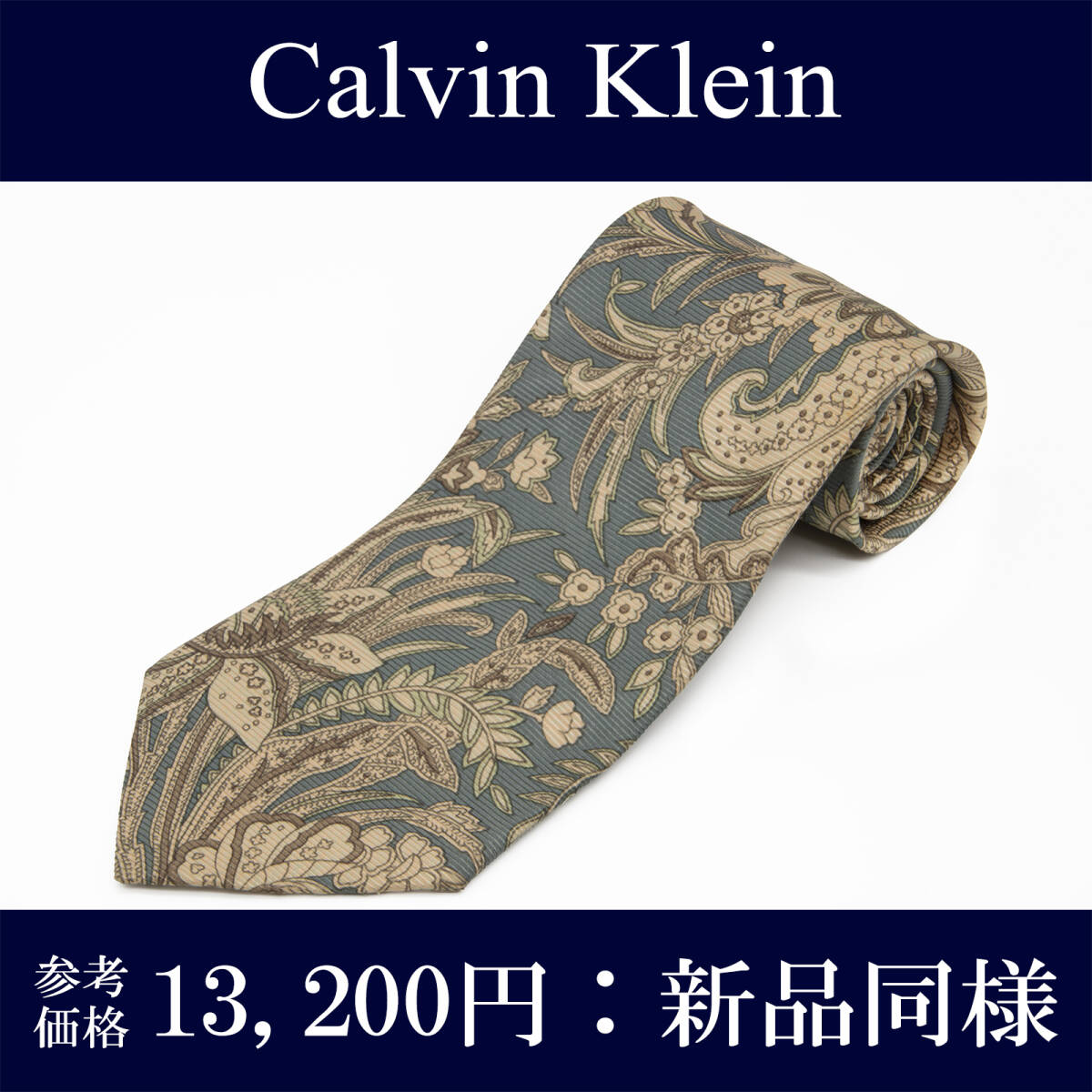 - 送料無料 カルバンクライン ネクタイ レギュラータイ 新品同様 シルク 青 グレーブルー ベージュ 茶色 黄緑色 花 葉 リーフ ブランド P163