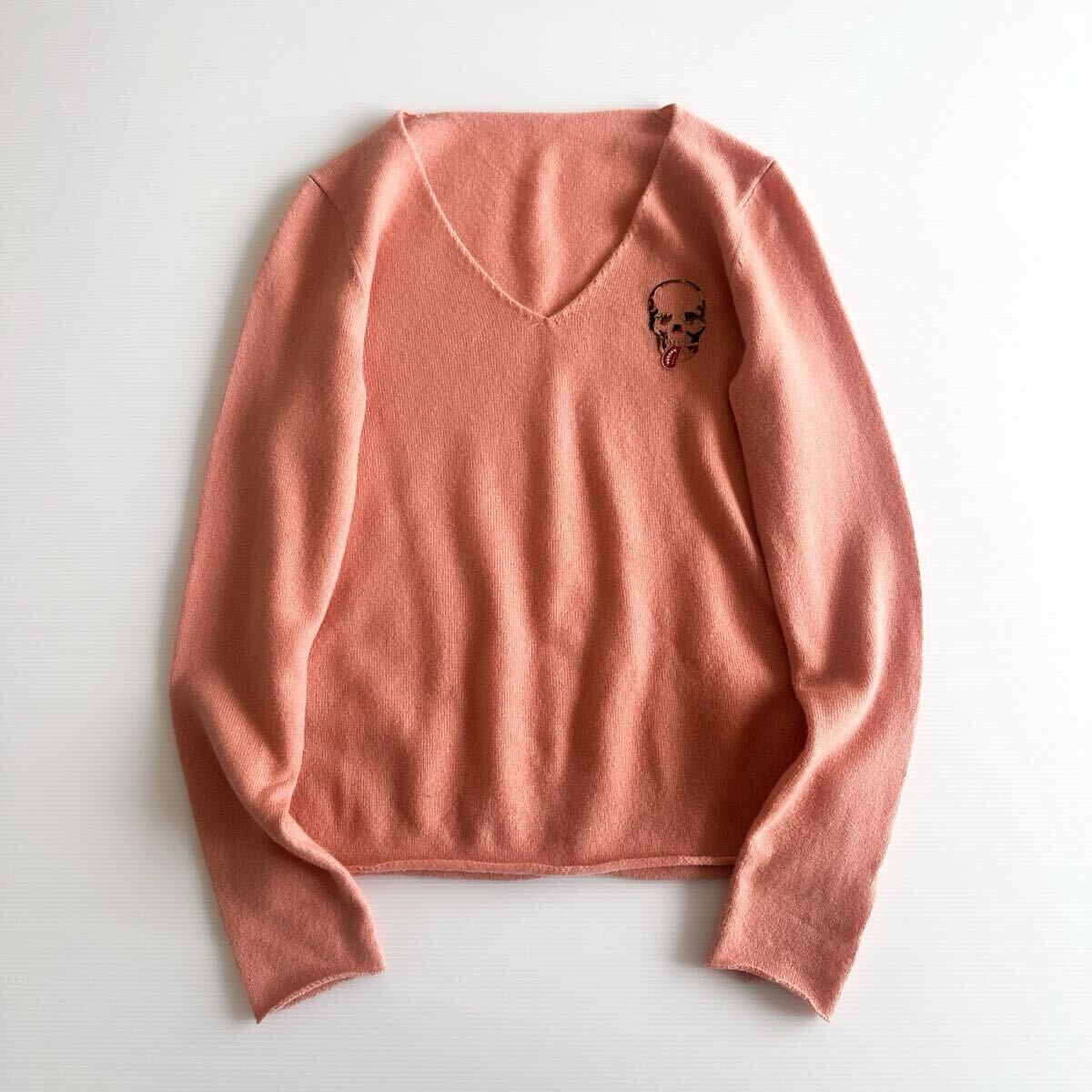 > ★ 【カシミヤ100%】 lucien pellat-finet ルシアンペラフィネ / スカル刺繍 Vネックニット ピンク XS ドクロ