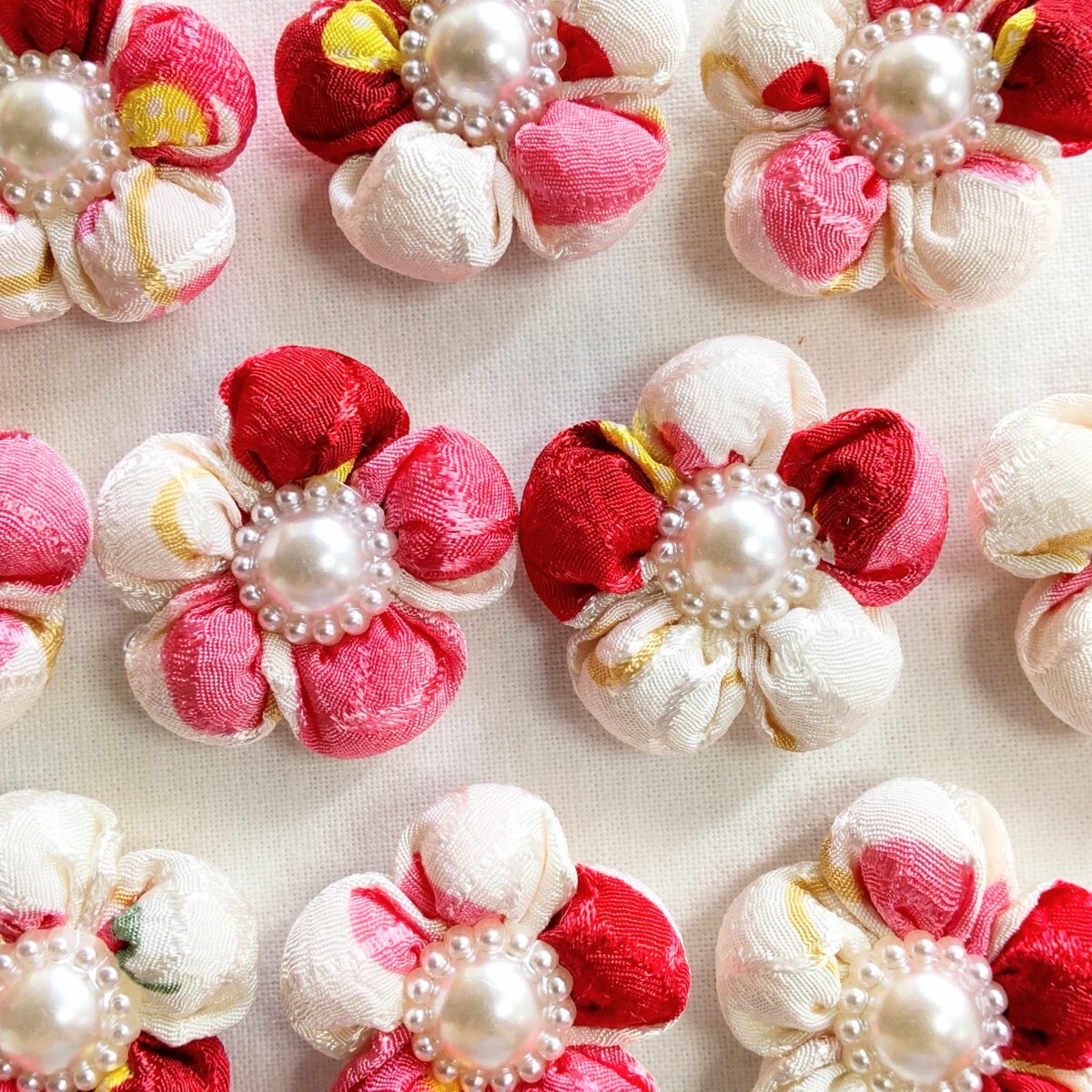 > 10個 赤と白 和風 和柄 パールストーン付き ふんわりお花 モチーフ ハンドメイド