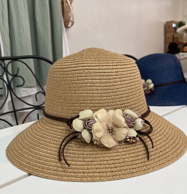 - ★麦わら帽子 ★可愛いストローハット 革のリボンとオーガンジーのフラワー 折りたたみ可能 沖縄 ハワイ 旅行時の携帯に!