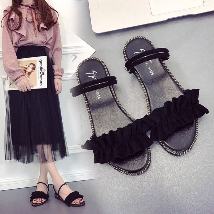 - 送料無料★即納 新品 華奢見え細ストラップサンダル フリル ペタンコサンダル 可愛い フラットサンダル サンダル★39/ブラック