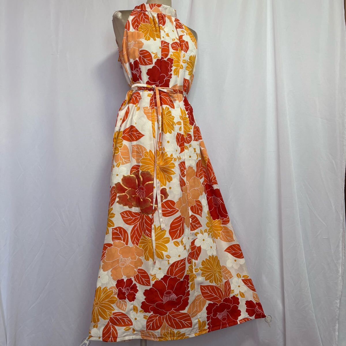- 着物リメイク★401★生成色黄色赤茶振袖ホルターネックロングワンピース・ストール★総柄花々駒刺繍★M★正絹