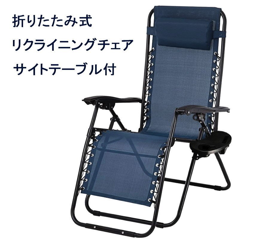 - 【送料無料】折りたたみ式 リクライニングチェア ★サイトテーブル付 椅子 キャンプ BBQ アウトドア レジャーに 耐荷重149Kgネイビー