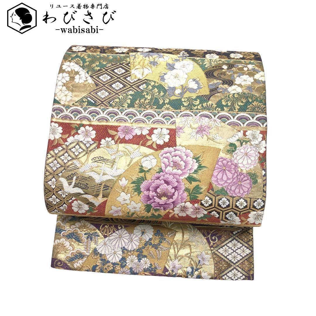 > 袋帯 帝王紫 じゅらく 地紙紋に四季の花々 牡丹 菊 鶴 O-2577 着物 きもの kimono 和服 和装 中古 リサイクル着物 【送料無料】
