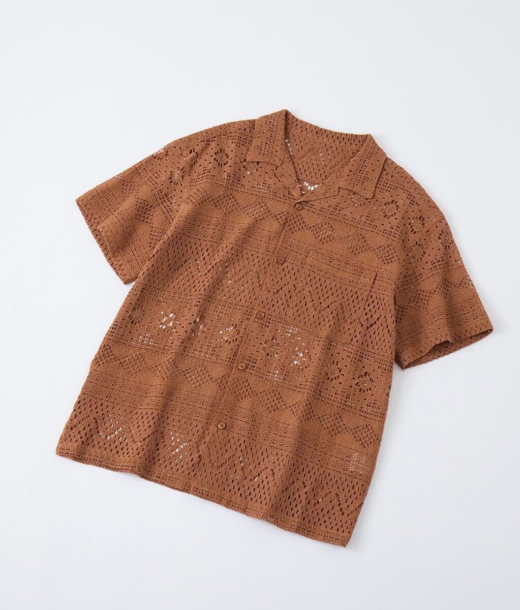 - MONO-MART モノマート 幾何学レースオーバーサイズオープンカラー半袖シャツ ブラウン トップス
