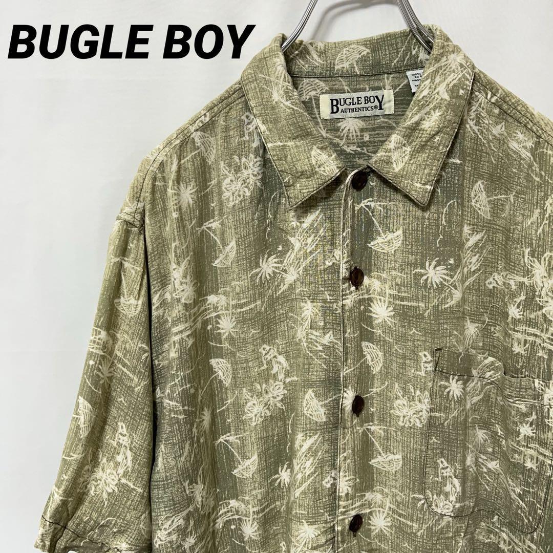 - N-5055 BUGLE BOY ブーグルボーイ アメリカ古着 アロハシャツ ハワイアンシャツ 総柄 パラソル 椰子の木 半袖 レーヨン M メンズ