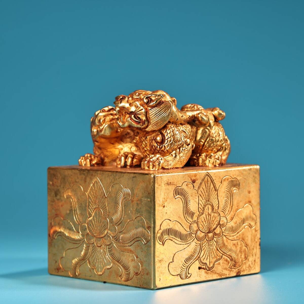 - 『館蔵珍品 銅製 塗金 子母獣印章 箱付 置物 賞物』稀少珍蔵品 古賞物 貴重物品 収蔵品 中国古美術 時代物 古董品