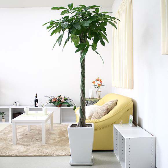 - ブルーミングスケープ|観葉植物 パキラ 10号+スクエアホワイトロング陶器鉢 ストレート 土の表面:ウッドチップ