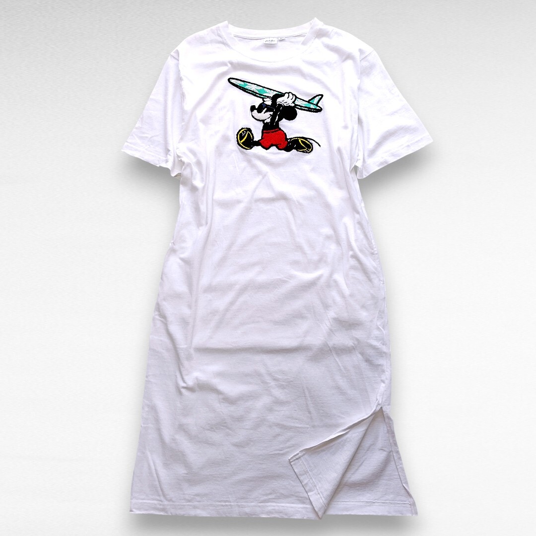 - 美品 HULALANI フララニ サーフ ミッキーマウス ロング丈ワンピース 白 サーフィン 半袖 モコモコワッペン 250716-01