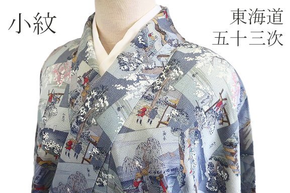 > 【送料無料】美品 小紋 縮緬地 東海道五十三次 ブルーグレー 身丈156cm 袷 お洒落 カジュアル 仕立て上がり 正絹 着物フィ m-8041