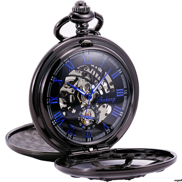 - 【ブラックスケルトン文字盤】懐中時計 アンティーク おしゃれ ラダーケース ローマ数字 チェーン付き プレゼント ギフト