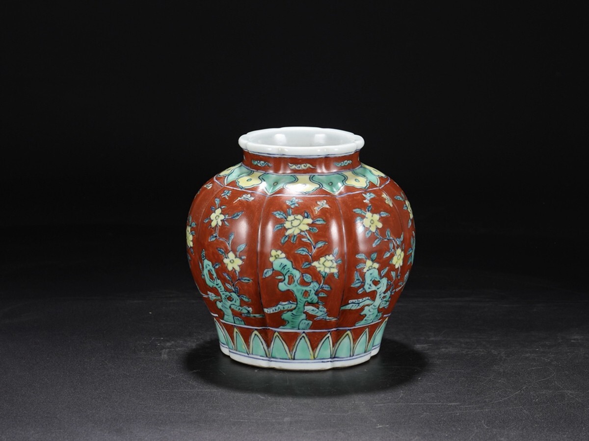 - 「明 萬暦年製 陶磁器 青花黄緑彩紅地花卉紋 瓜稜大罐」染付 置物 擺件 古賞物 中国古美術 旧蔵出