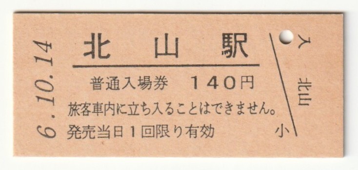 - 平成6年10月14日 仙山線 北山駅 140円硬券普通入場券(日付印刷)