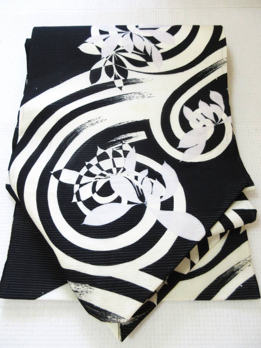- 52-4.帯 黒地 花 和装 名古屋帯 粋モダン