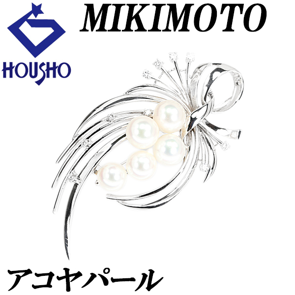 > ミキモト アコヤ真珠 ブローチ ダイヤモンド K14ホワイトゴールド MIKIMOTO リボン ブーケ 透かし 送料無料 中古 宝正 902022