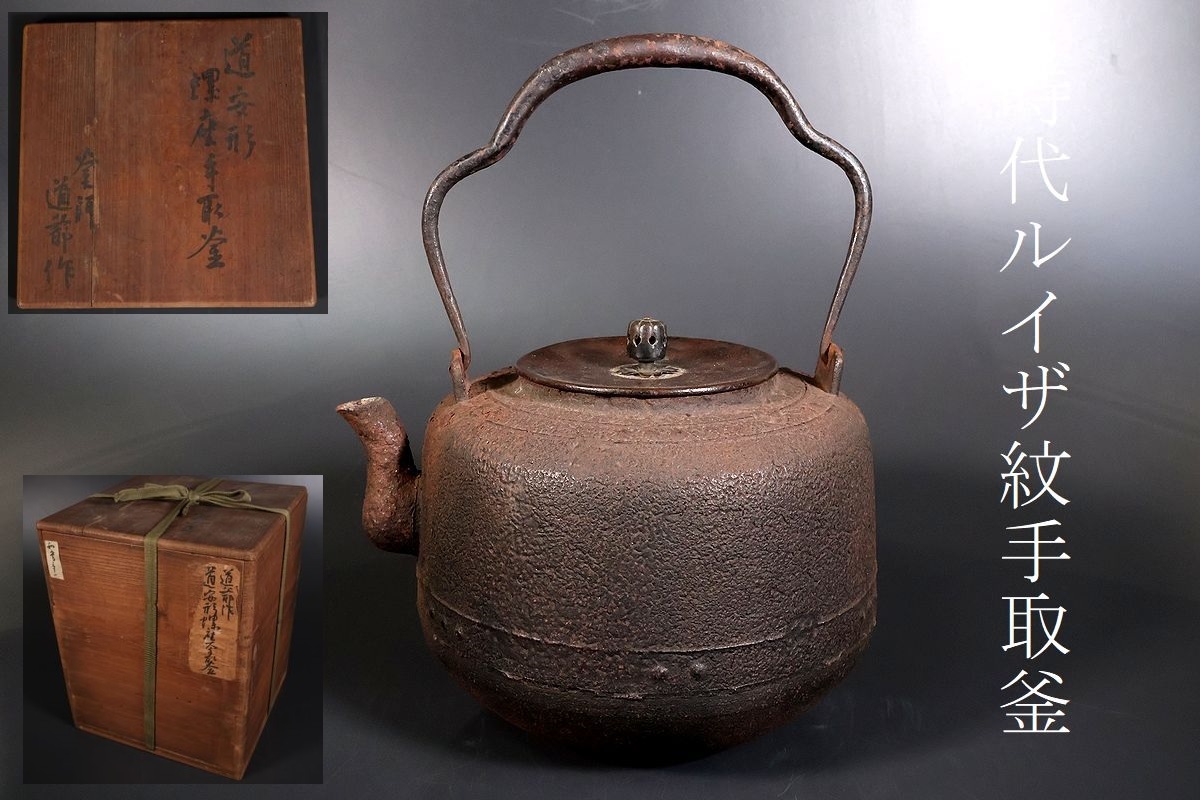 > 【小】5211 江戸期 時代鉄 道安形ルイザ手取茶釜 伝来「西村道爺作」 時代伝世箱有 鉄瓶 茶道具 古美術収集家放出品