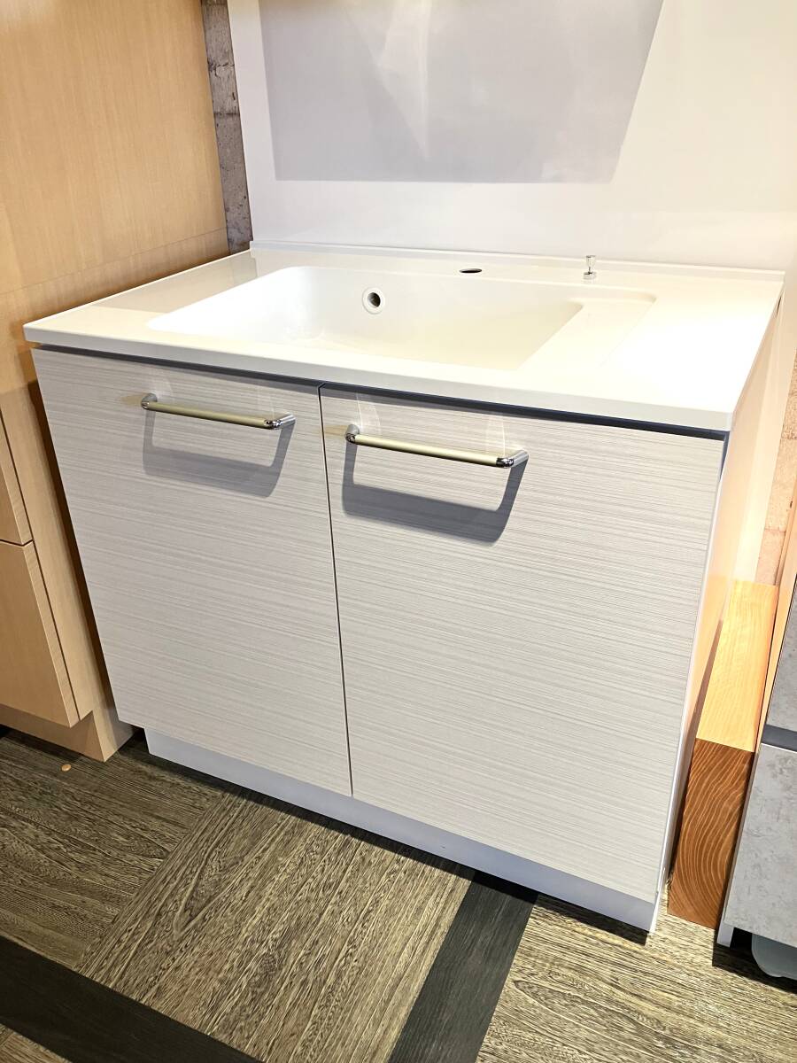 - 新品未使用品!★90cmオーダー洗面化粧台(ホワイトオーク柄扉(※よこ柄)/人大一体ボール/開き扉/水栓無/下台のみ)★定価86,000円