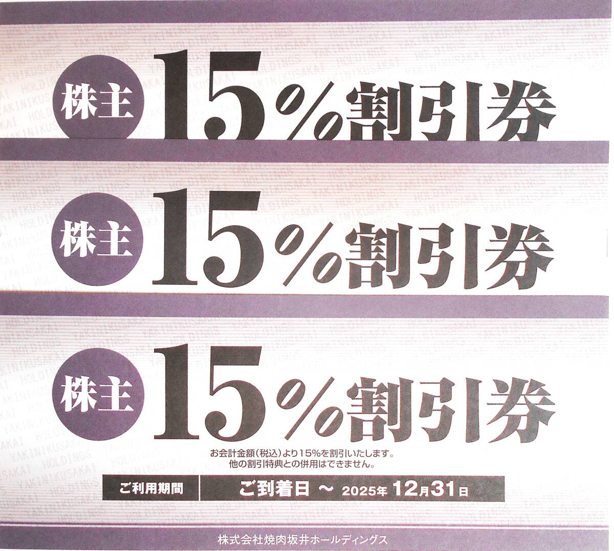 - 2025年12月まで【送料無料】焼肉坂井ホールディングス 株主優待15%割引券×3枚☆焼肉坂井☆村さ来☆とりあえず吾平