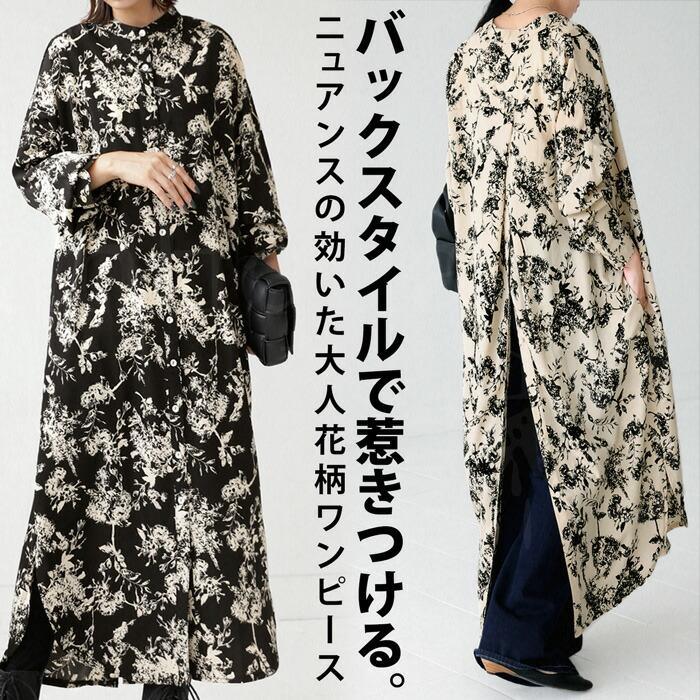 - 試着程度極美品です アンティカ* バックスタイルで惹きつける。大人花柄ワンワンピース ブラック×エクリュ花柄 長袖 ゆったり
