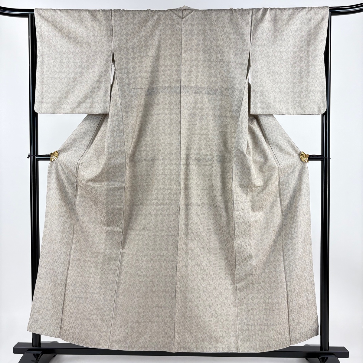 > お召 身丈156.5cm 裄丈65.5cm M 袷 菱 幾何学模様 灰茶 正絹 逸品 【中古】