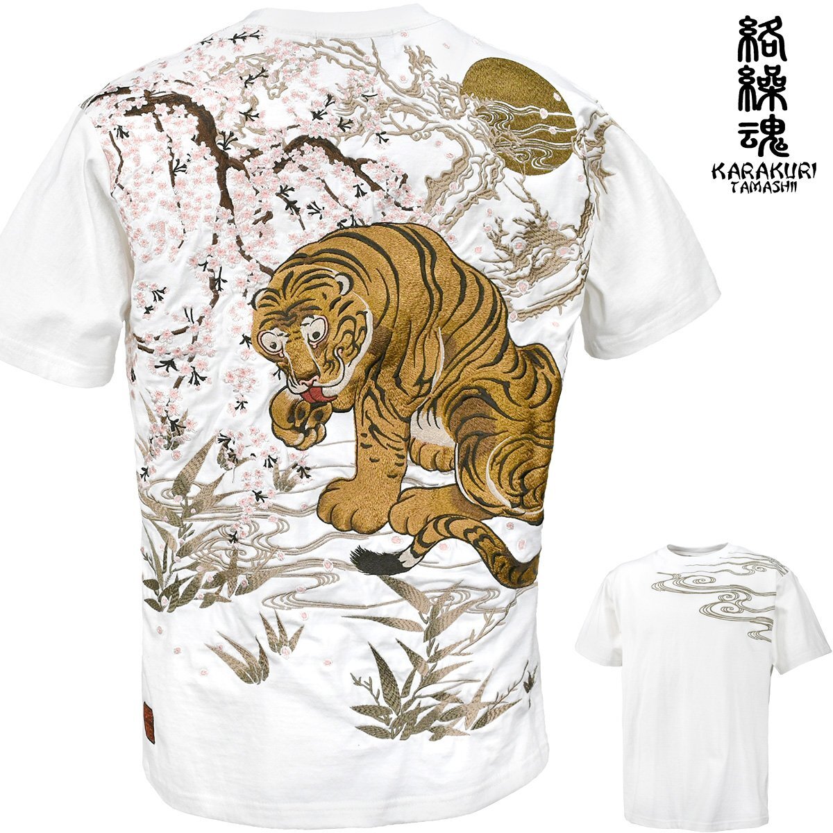 > 232035-10 からくり魂 絡繰魂 粋 クルーネック 虎図 若冲 浮世絵 半袖Tシャツ 和柄 刺繍 メンズ(ホワイト白) XXL 大きめ カラクリ魂