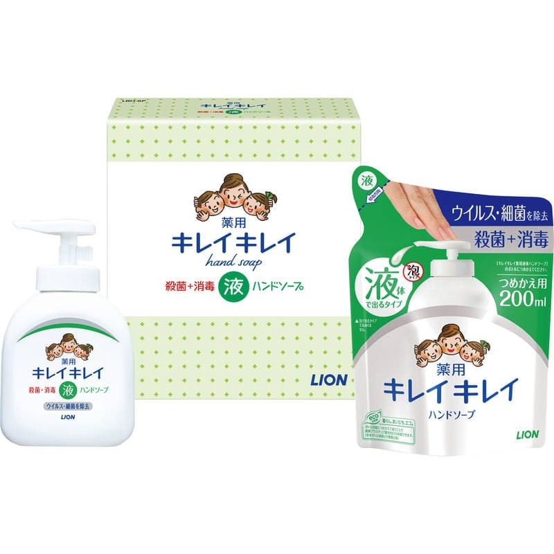 ▼▼▼▼▼▼注意事項▼▼▼▼▼▼・送料込み(送料800円が商品価格に含まれています) 一部地域では追加送料あり。・お取り寄せ商品です。弊社にて手配後、メーカー・卸業者からの直送になります。・まれにメーカー欠品、出荷遅延等が発生致します。問題発生時は別途メールにてご連絡致します。・配送方法の指定、日時指定、置き配、ギフト対応、他商品との同梱配送などは対応できません。・まとめ買いや複数購入の場合は通常より発送に時間が掛かる場合がございます・複数個口の場合、2階以上への搬入ができない場合があります。(その場合は1階での受け渡しとなります)・大型連休、お盆、年末年始などは発送をお休みさせていただく場合がございます・メーカー都合により、パッケージは予告なく変更される場合がございます・梱包用のダンボールはリサイクル品を使用させていただきます。・注文に関するご連絡(注文確定通知・発送通知など)はメールでご案内させていただきます※商品ページの内容について、少しでもご不明な点などがございましたら購入前に一度ご連絡ください▲▲▲▲▲▲注意事項▲▲▲▲▲▲〇商品説明殺菌成分でしっかり除菌するライオンキレイキレイシリーズの薬用液体ハンドソープセット。〇商品仕様【パッケージサイズ】162×178×58mm【内容】薬用液体ハンドソープ:250mL・詰替:200mL×各1【生産国】日本【パッケージ形態】化粧箱入