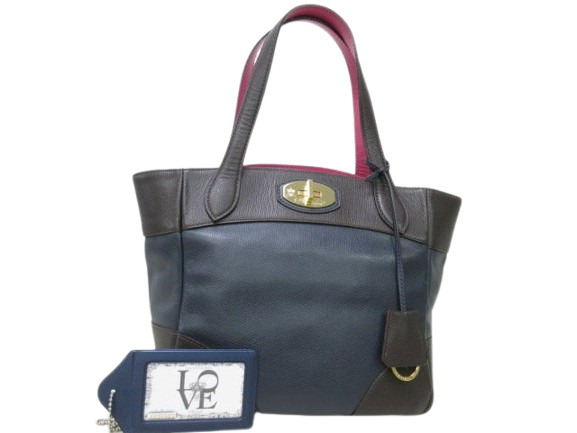 - エーディーエムジェイアクセソワ ハンドバッグ - レザー - ターンロック ゴールド金具 ネイビー×ブラウン【本物保証】