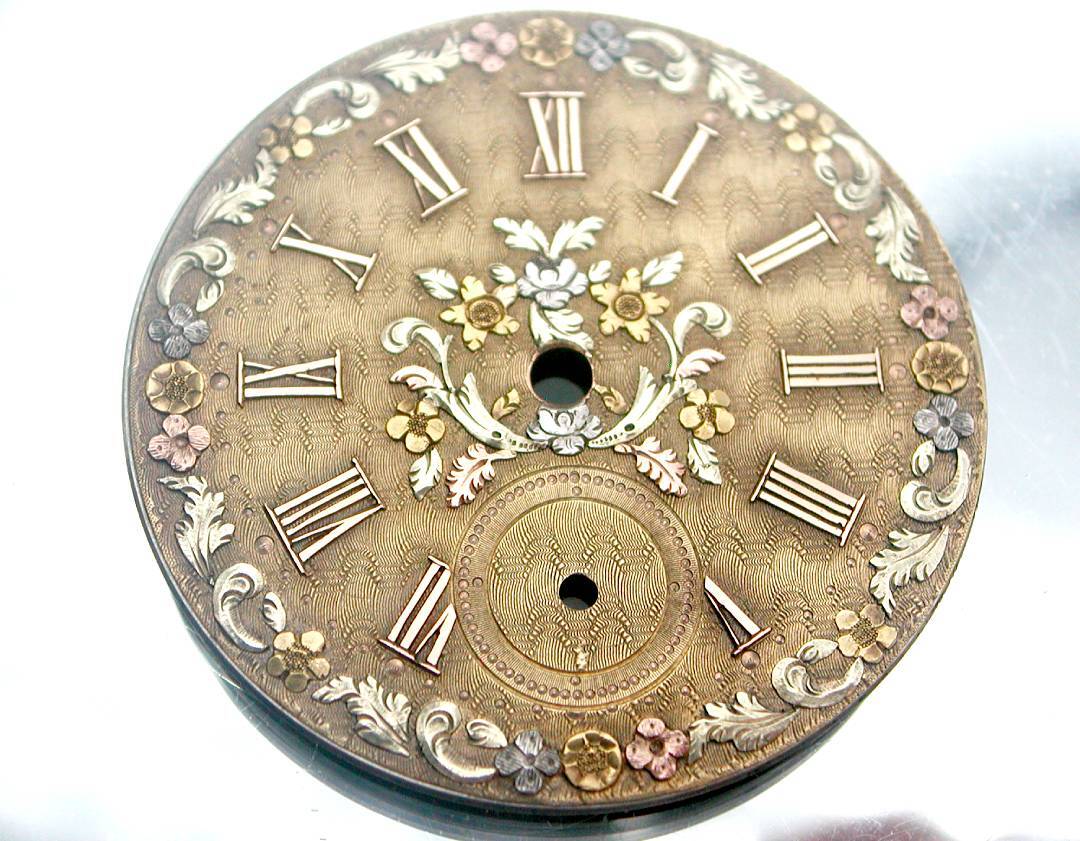 - ◎古◎極上★レア★金無垢文字盤★手彫りマルチカラー装飾文字盤★9K位★被せタイプ★16サイズ★懐中時計用★43.3mm