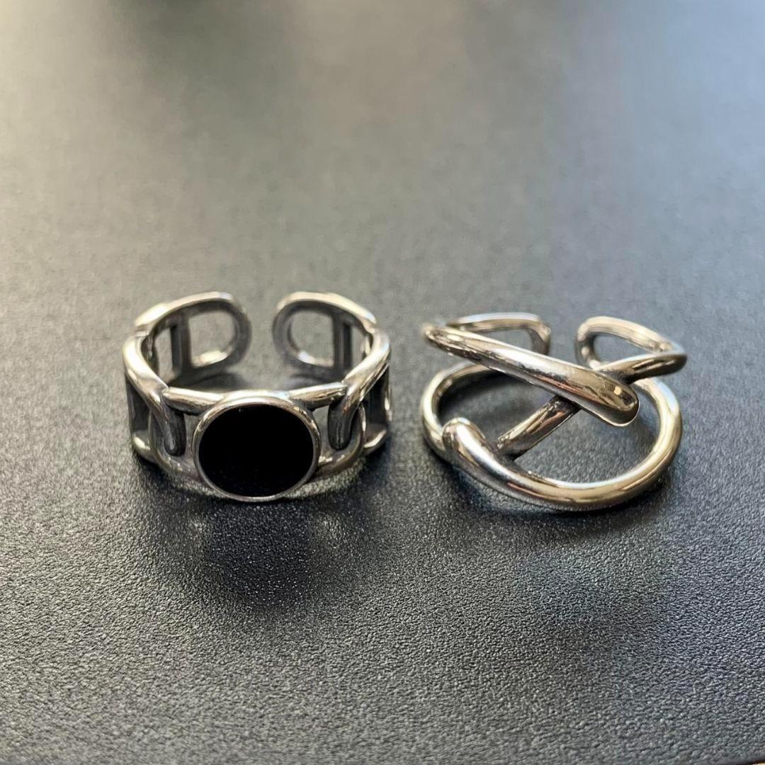 > 190 ブラックストーン&Wライン リング S925 刻印 2個セット シルバー 指輪 ジュエリー アクセサリー シンプル かわいい レディース 韓国