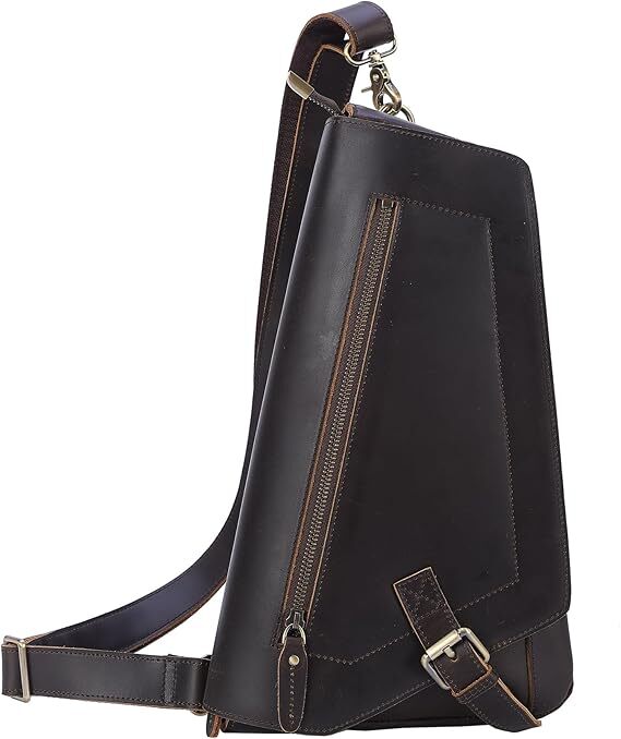 - レトロ 台形 ボディバッグ 厚手牛革 ワンショルダーバッグ 横縦2WAY オイルレザー バイク ダークブラウン