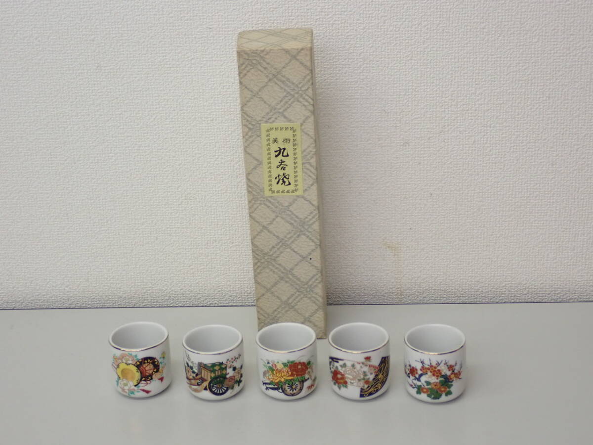 - 陶磁器-107; 美術九谷焼 ぐい呑み 酒杯 盃 酒器 5客揃 高さ;約4.5×径;4.6cm 元紙箱付き ★
