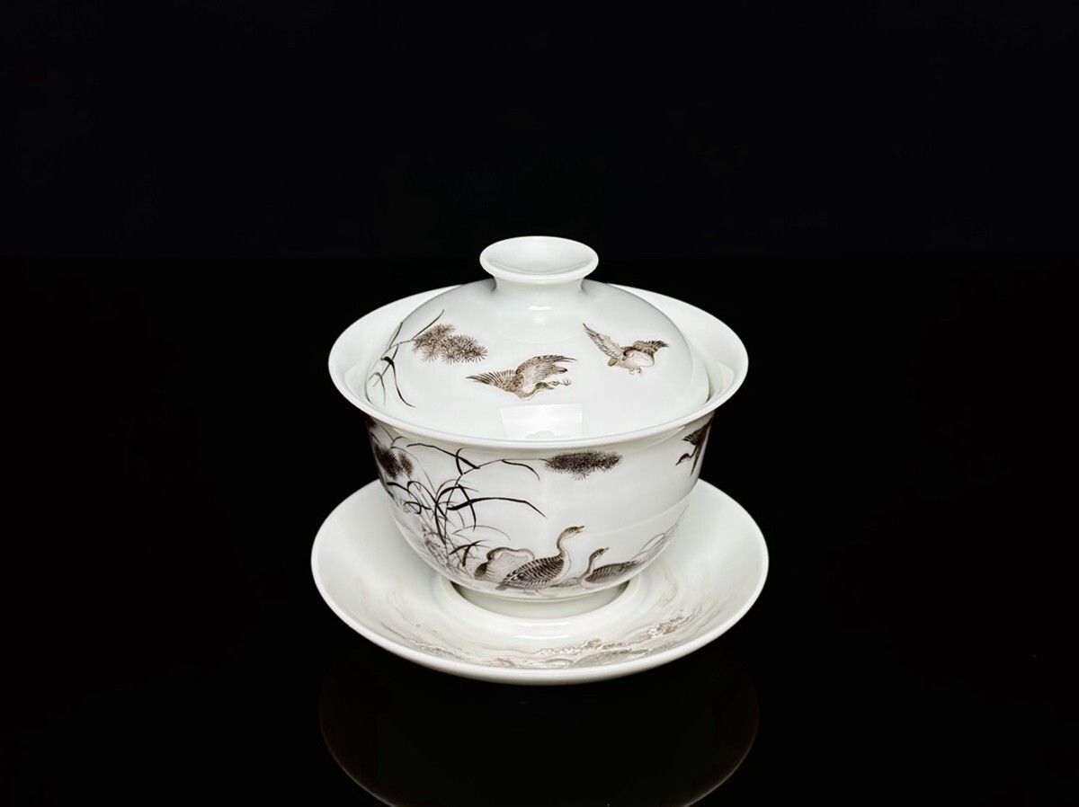 - 「清 雍正年製 陶磁器 墨彩大雁蘆葦 題詩 三才蓋碗」染付 置物 擺件 古賞物 中国古美術 旧蔵出
