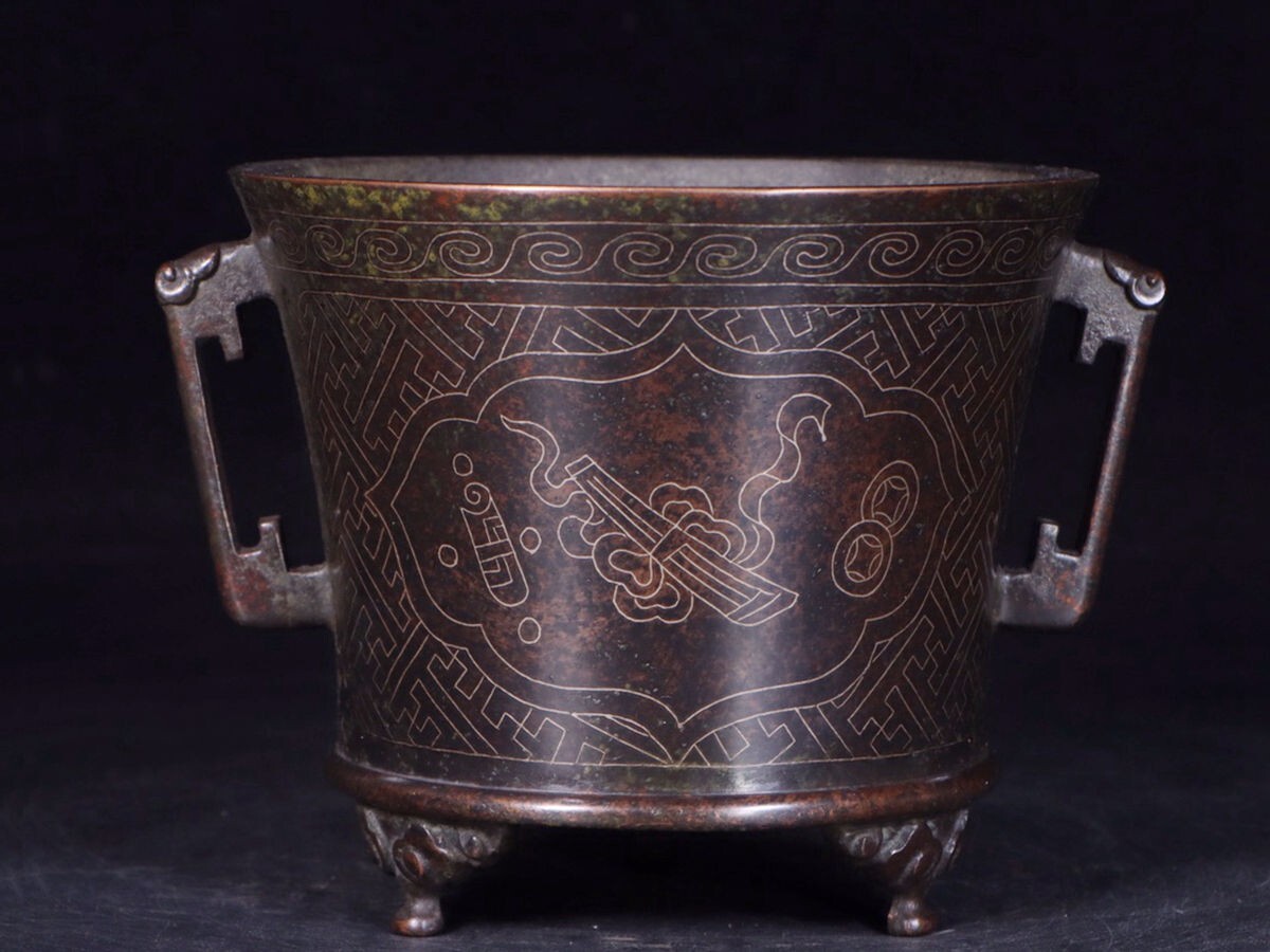 - 「明代 石叟 古銅彫 錯銀絲 龍耳老銅香炉」旧銅器 置物擺件 賞物 中国古美術 旧蔵出