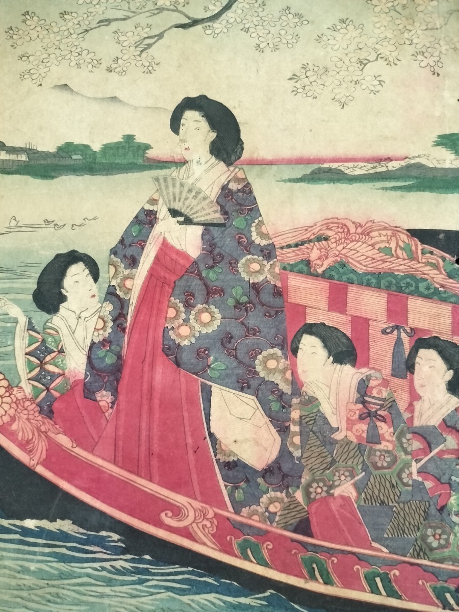 - 明治期/真作「遊舟」本物浮世絵木版画 美人画 錦絵 大判 裏打ち