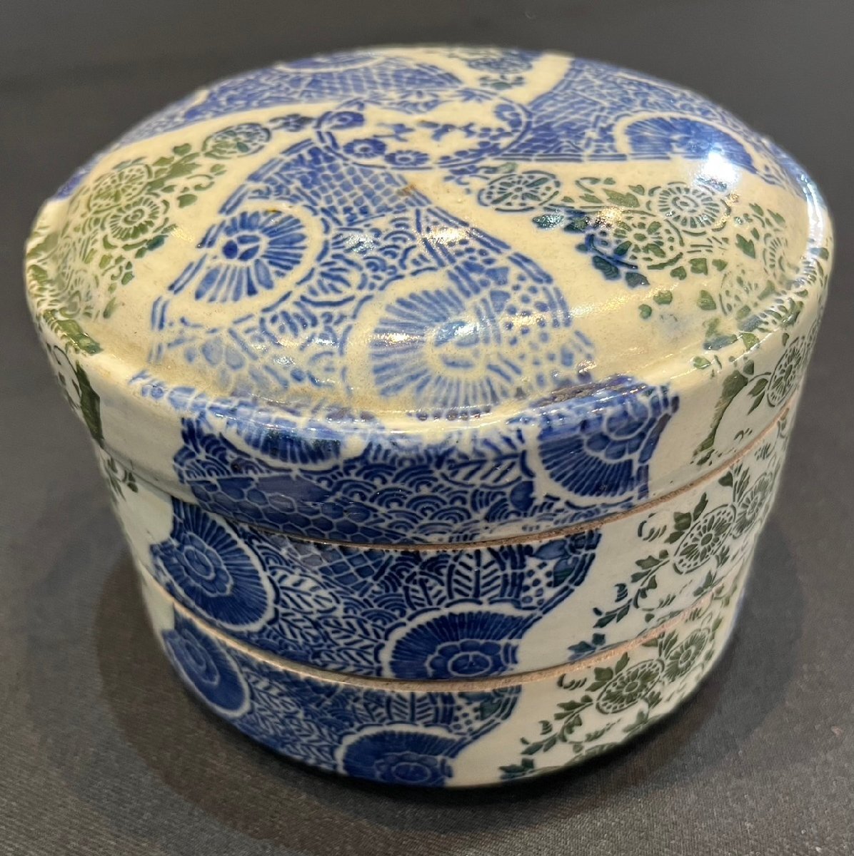 - ★ヴィンテージ 明治前期 紙刷捻子に幾何学と桐図 二段重 小ぶり 少甘手 骨董品 1段サイズ(約)直径14×深3.5cm