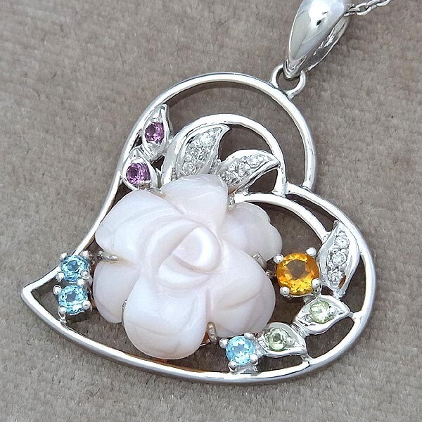 > K18WG マルチ石入ピンクシェルペンダント付 ネックレス 0.32ct D:0.05ct 7.5g 40cm