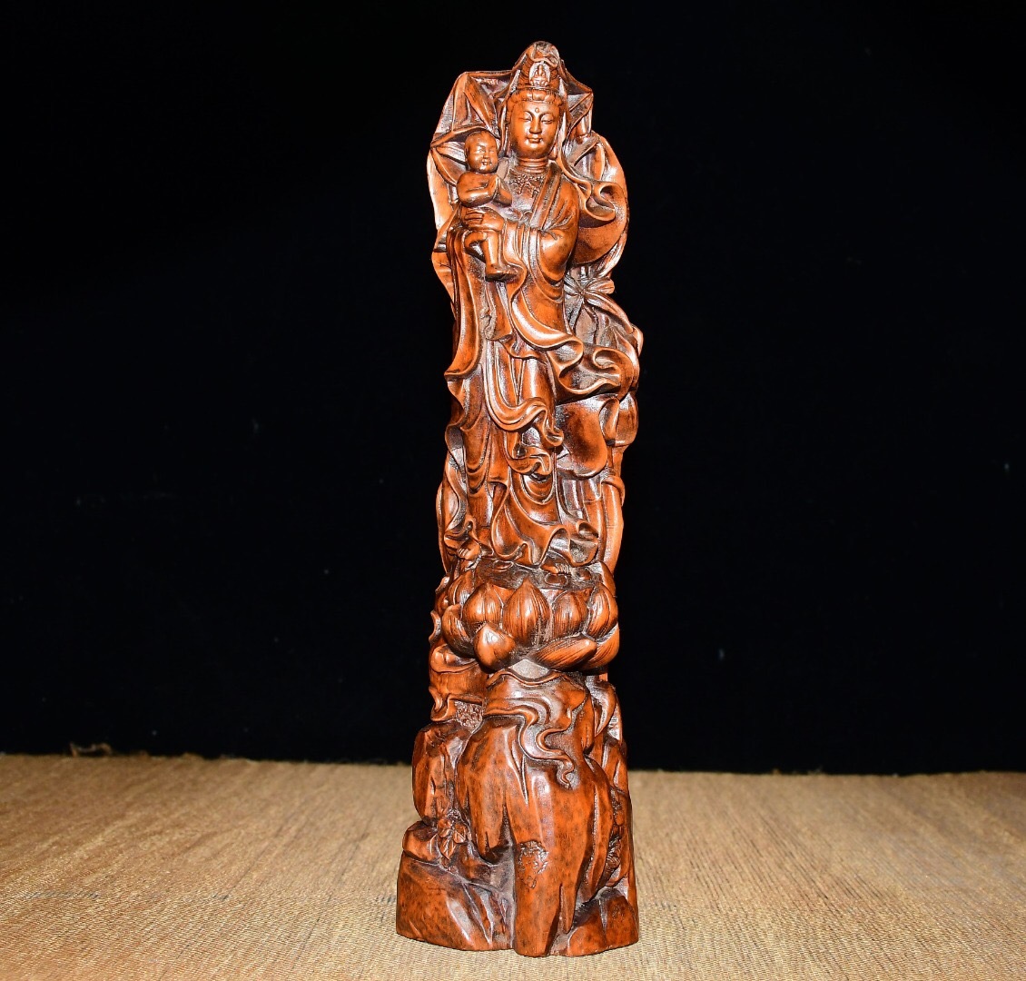 - 蔵友旧蔵出 小葉黄楊木製 細密彫 送子觀音像 文房具 供養品 置物擺件 稀少珍藏品 古賞物 中国古玩 中国古美術品