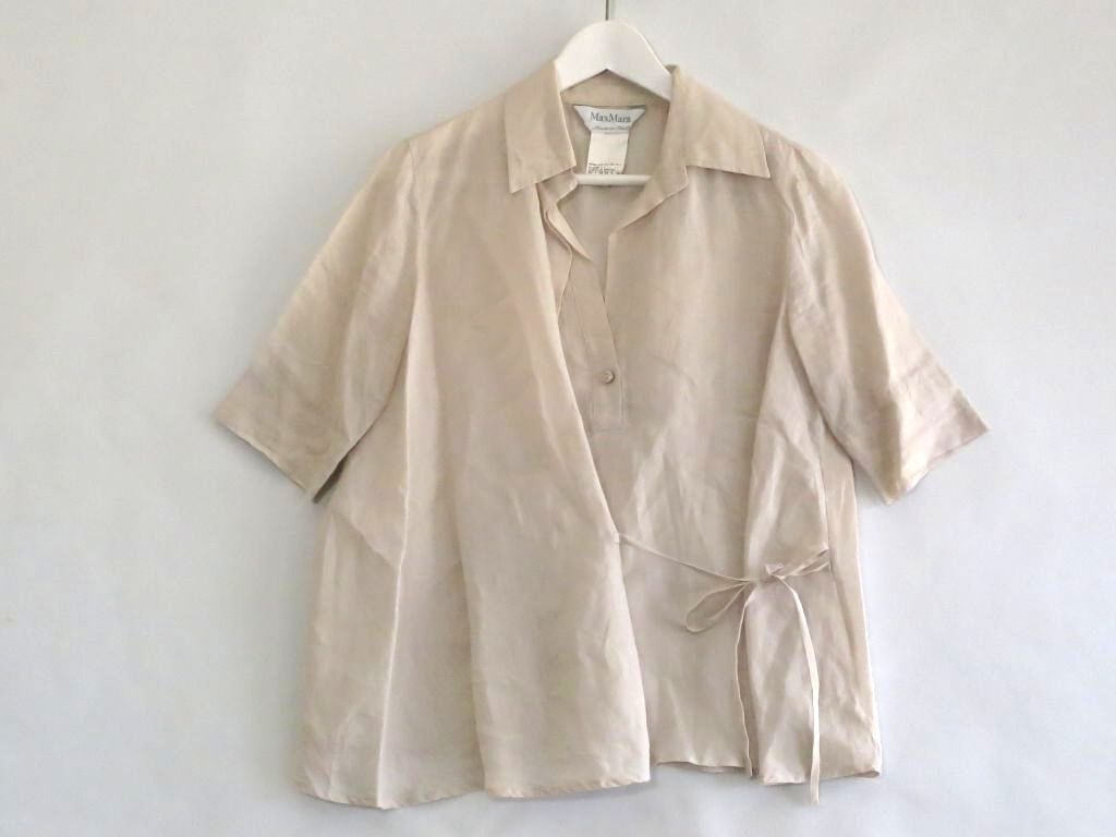 - マックスマーラ 白タグ 半袖 オープンカラーシャツ ラミー 透け感/張り感 ・38 11111292 ライトベージュ sy5016224998