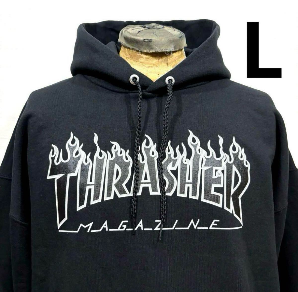 - L 新品 黒 THRASHER スラッシャー ファイヤー フレーム パーカー フレイムス 古着 スウェット スケートボード スケボー スケーターゆるだぼ
