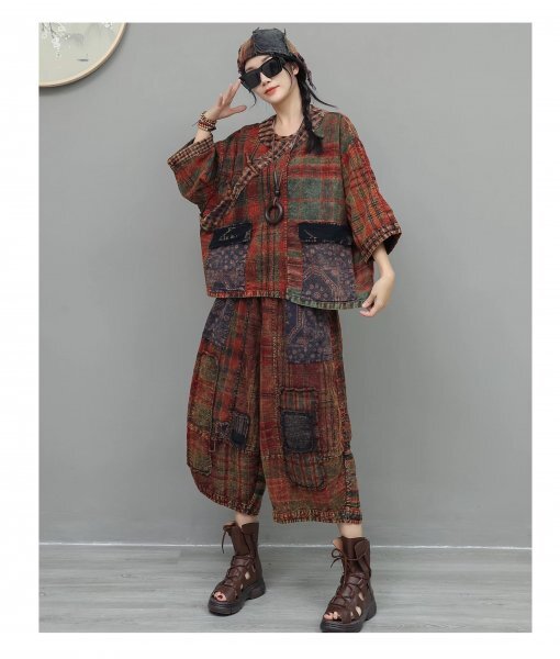 - gl 2508 チュニック トップス 豪華刺し子 バッチ 綿&麻 洋服ミックス アンティーク風 ロマンファッション 縫い合わせ チェック柄
