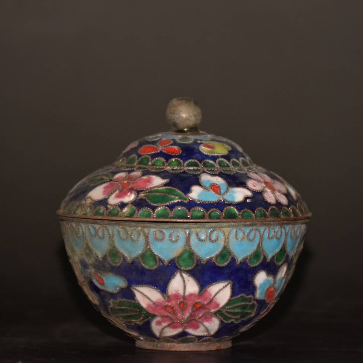 - 【超珍館蔵】紫銅製 景泰藍 琺瑯彩 牡丹花紋 蓋碗 置物 賞物 古賞物 古董品 古美術品 時代物 旧家蔵出 稀少珍蔵品