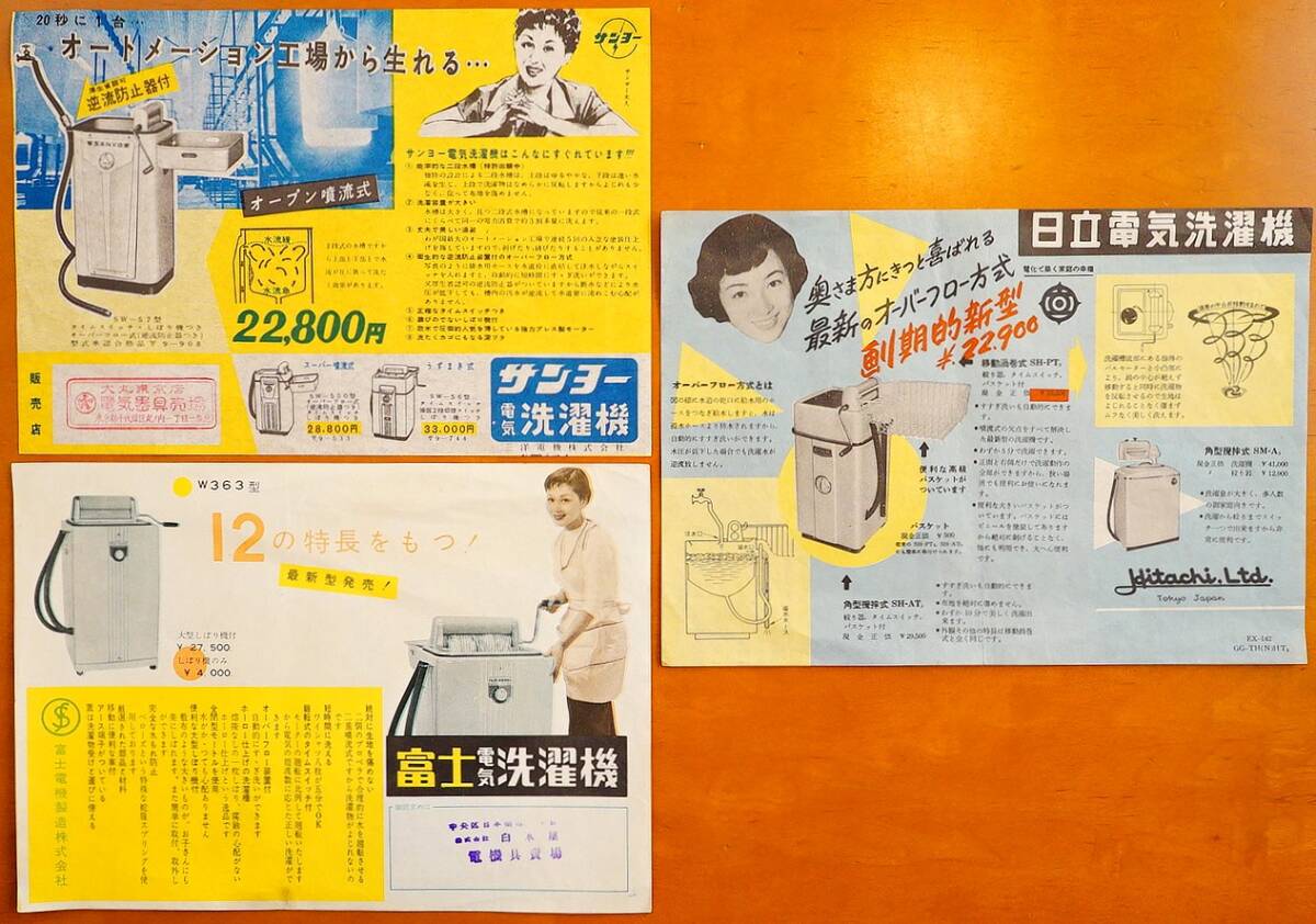 - サンヨー/富士電気/日立 電気洗濯機 チラシ3枚 三洋電機/富士電機製造/日立(株) 発行 検:オーバーフロー式 ランドリー 昭和レトロ家電