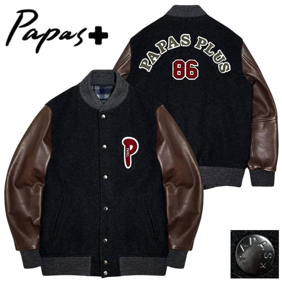> 極美品 定価10万 Papas+ パパス プラス Pロゴ サガラワッペン 刺繍 カシミヤ アルパカ メルトンウール 袖革 スタジャン M 牛革 ジャケット