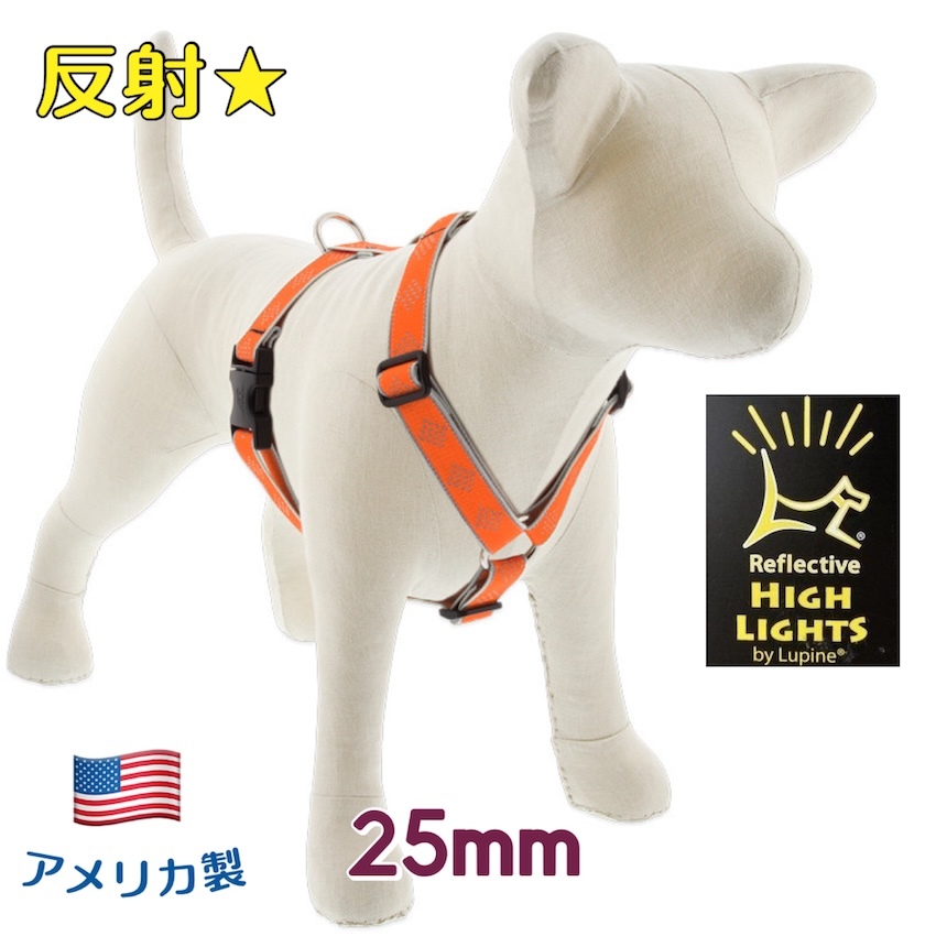 > ローマンハーネスXLサイズ25mm幅 反射オレンジダイヤモンド柄 60-96cm LUPINE アメリカ製 軽量丈夫 大型犬 ReflectiveHighLights
