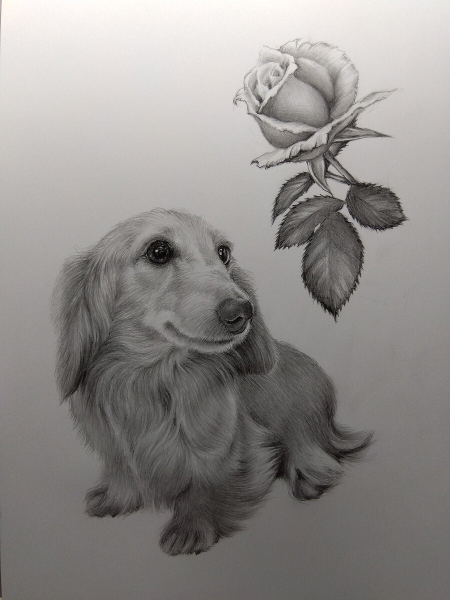 - 犬の絵 「ミニチュアダックス薔薇の香りDAR-VOL25-1」鉛筆画 Atelier809 作 A4サイズ真作です。 ※額縁は付いていません。