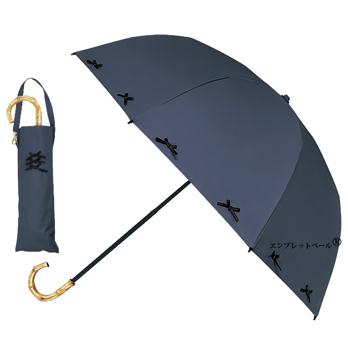 - まるいシルエット 完全遮光 薄型 2段 折りたたみ傘 晴雨兼用 リボン ネイビー×ブラック 親骨50cm 広げたサイズ直径77cm