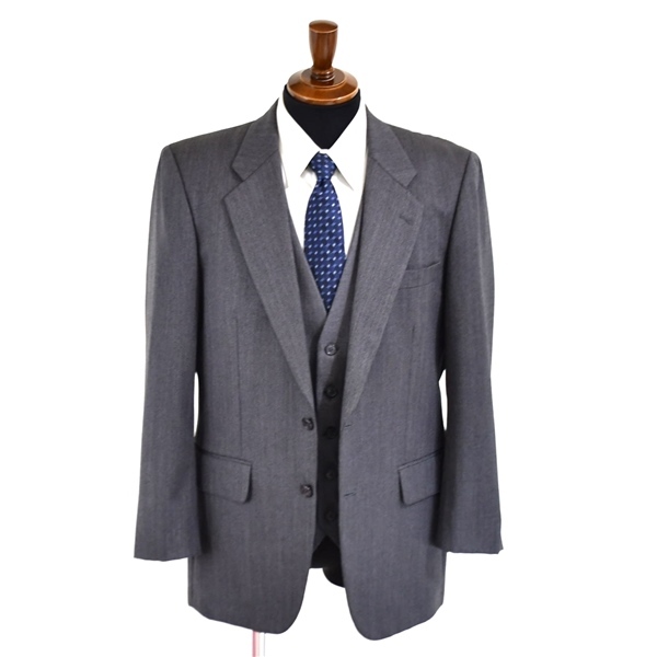 ・型番:-。秋冬対応。2つボタンシングル。フラップポケット。センターベント。袖口3つボタン。開き見せ。総裏地仕上げ。ネーム刺繍あり。5つボタンベスト。