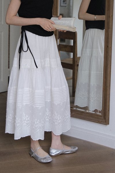 - kr 2408スカート ゆったり フリーサイズ 大人可愛 ナチュラル 刺花柄 綿100% サラサラ ホワイト