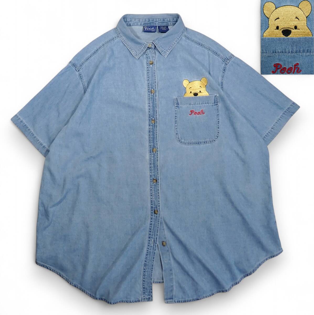 > 6925/Pooh Disneyオフィシャル90sビンテージ 半袖デニムシャツ 22W/24Wビックサイズ オーバーサイズ●プーさん刺繍●洗濯プレス済●古着