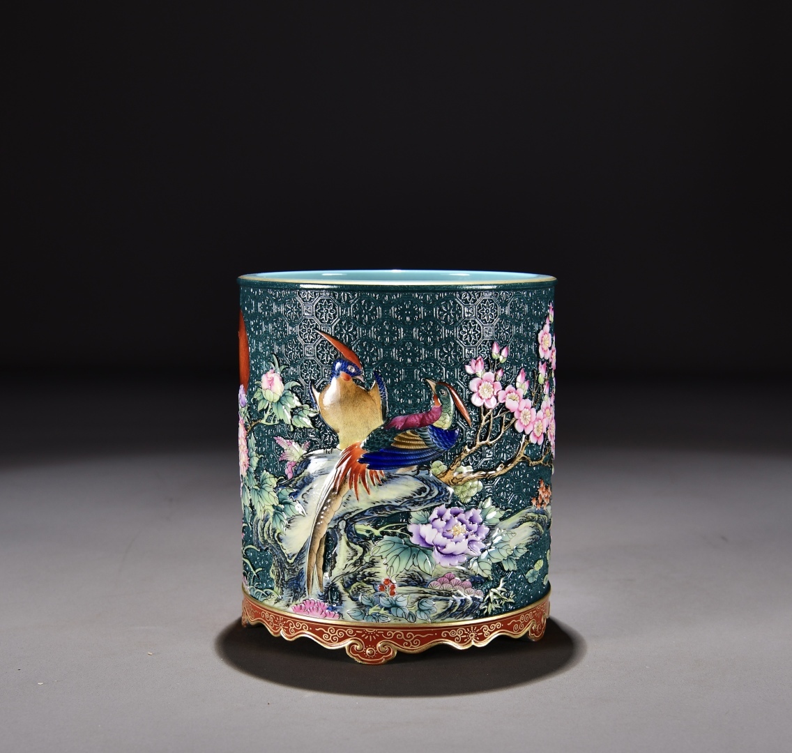 > 多宝閣 ■ 207072 中国磁器 中国骨董【清朝の乾隆時代の、ファミーユローズの花模様が施された金箔のブラシホルダー】 置物 收藏品 孤品